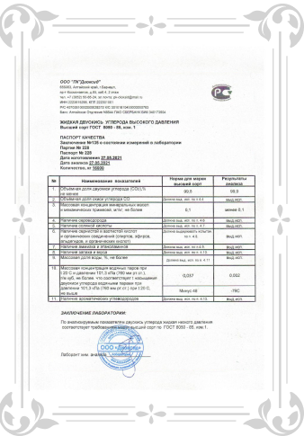 ПАСПОРТ КАЧЕСТВА: ДВУОКИСЬ УГЛЕРОДА ЖИДКАЯ НИЗКОТЕМПЕРАТУРНАЯ