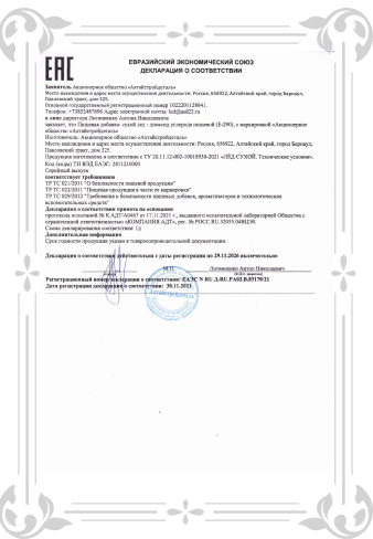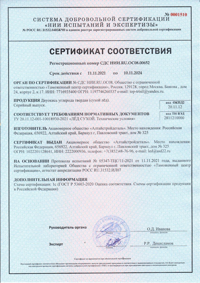 СЕРТИФИКАТ СООТВЕТСТВИЯ: ДВУОКИСЬ УГЛЕРОДА (СУХОЙ ЛЕД)
