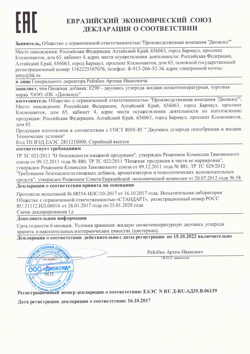 СЕРТИФИКАТ СООТВЕТСТВИЯ: ДВУОКИСЬ УГЛЕРОДА ЖИДКАЯ НИЗКОТЕМПЕРАТУРНАЯ