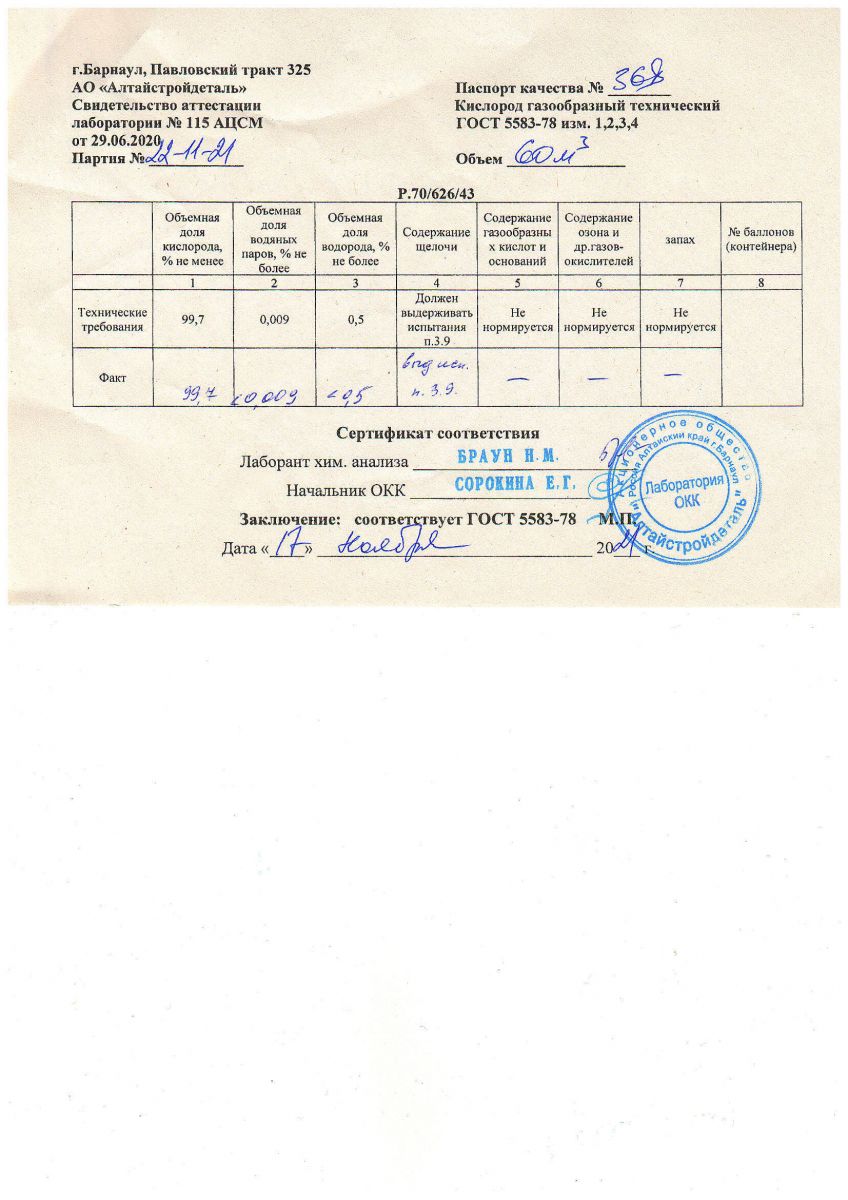 ПАСПОРТ КАЧЕСТВА: КИСЛОРОД ГАЗООБРАЗНЫЙ ТЕХНИЧЕСКИЙ