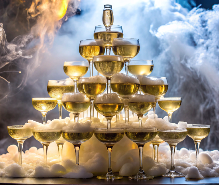 Очень зрелищно смотрится пирамида с шампанским, если она с сухим льдом. Сухой лед кладется напрямую в бокалы, благодаря чему горка окутывается загадочным туманом, делающим атмосферу более торжественной и романтичной.