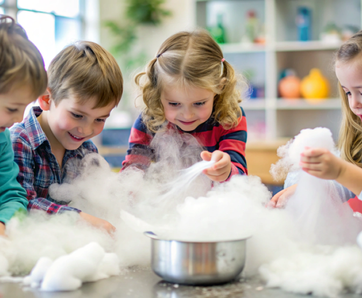 Всё оборудование уже есть у вас дома. Для создания эффектов подойдет любая посуда. Дети сами смогут повторить эти опыты.